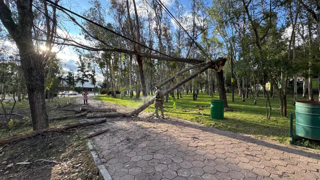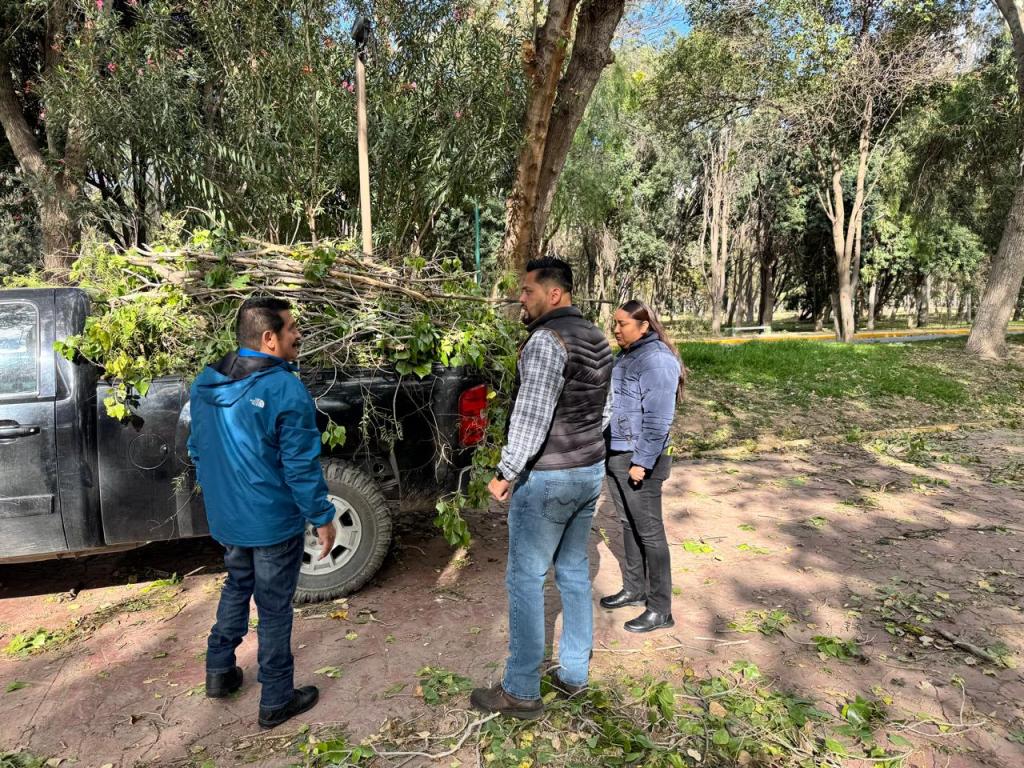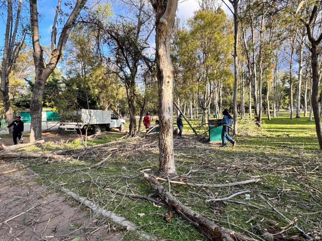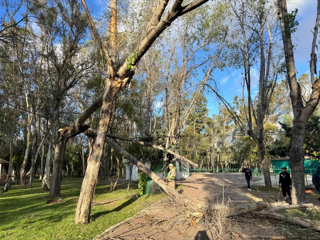 Por instrucción del Gobernador del Estado, Ricardo Gallardo Cardona, el equipo operativo trabaja en el retiro de ramas, árboles dañados y otros elementos, por lo que se recomienda evitar permanecer cerca de árboles o áreas con ramas visiblemente dañadas, respetar las zonas delimitadas por el personal de mantenimiento y guarda parques, seguir las instrucciones del personal operativo y mantenerse alerta ante posibles caídas de ramas.