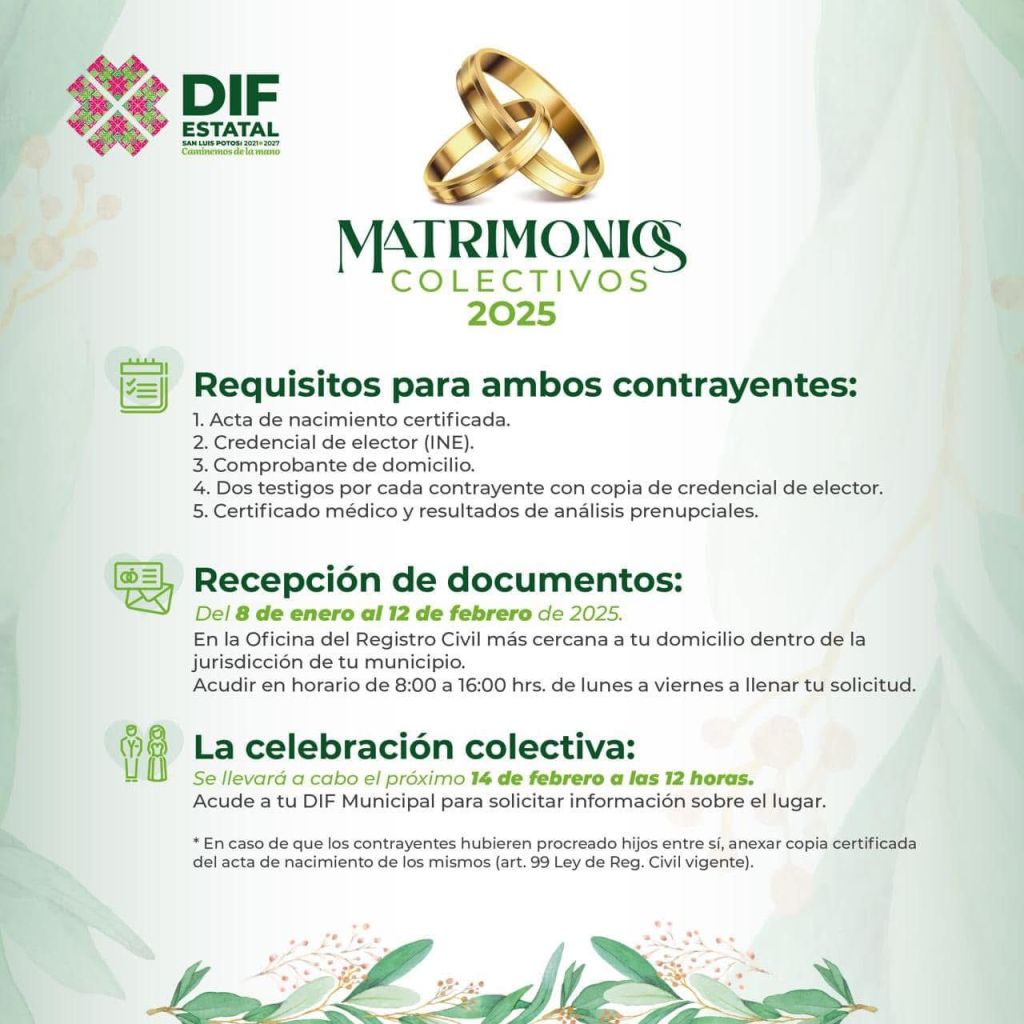 El Sistema Estatal para el Desarrollo Integral de la Familia (DIF), implementa por cuarto año consecutivo la campaña de Matrimonios Colectivos 2025, que tiene como objetivo el brindar más apoyo a parejas y familias potosinas, formalizando su relación, por lo que invita a inscribirse hasta el 12 de febrero del presente año, en la oficina del registro civil más cercana, en un horario de 08:00 a 16:00 horas de lunes a viernes.