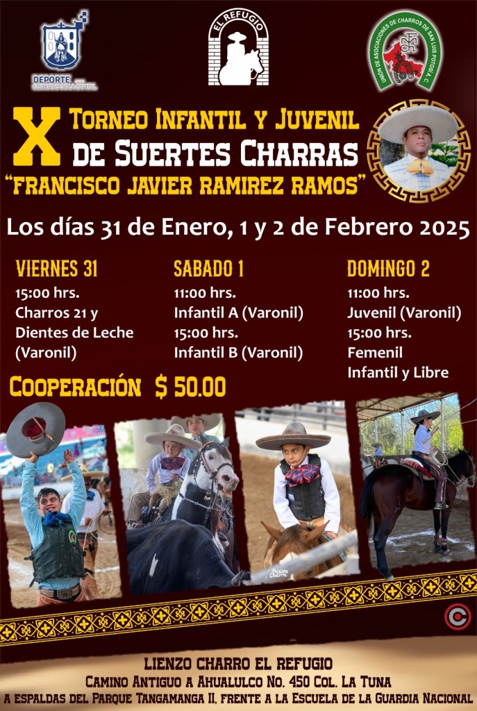 El Lienzo Rancho el Refugio de San Luis Potosí será la sede del X Torneo Infantil y Juvenil de Suertes Charras «Francisco Javier Ramírez Ramos», los días 31 de enero, 1 y 2 de febrero.