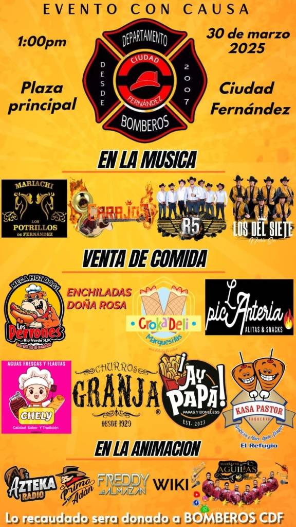 Ven a disfrutar de un gran evento lleno de música, comida y diversión, todo con el propósito de apoyar a nuestros bomberos de Ciudad Fernández 🚒❤️