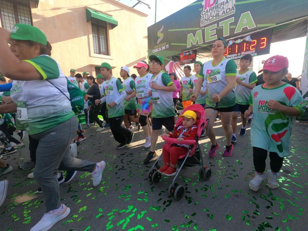 Con una atractiva participación en las distancias de 3 y 10 kilómetros, la Carrera Atlética de la Enchilada se consolida una vez más como la competencia de mayor prestigio, capacidad logística y, principalmente, premiación en efectivo y en especie para las y los ganadores de todas las categorías. La bolsa a repartir fue de más de 350 mil pesos en premios, destacando las categorías libre, varonil y femenil, silla de ruedas, infantil y a las y los primeros soledenses en llegar a la meta.