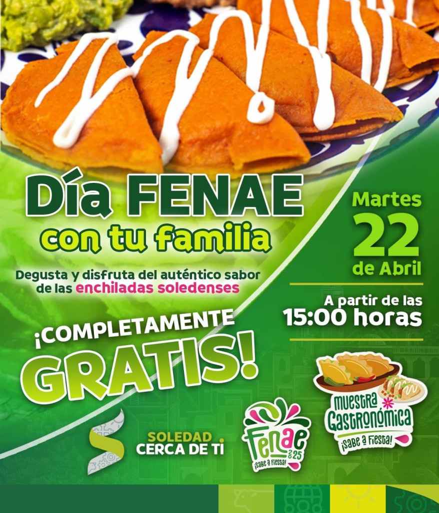 ¡Para enaltecer el patrimonio gastronómico de Soledad de Graciano Sánchez y encantar a propios y extraños, este martes, el Ayuntamiento hace una invitación abierta a toda la población a ser parte del “Día #FENAE con tu familia”🎉, y disfrutar de las deliciosas enchiladas potosinas completamente gratis!