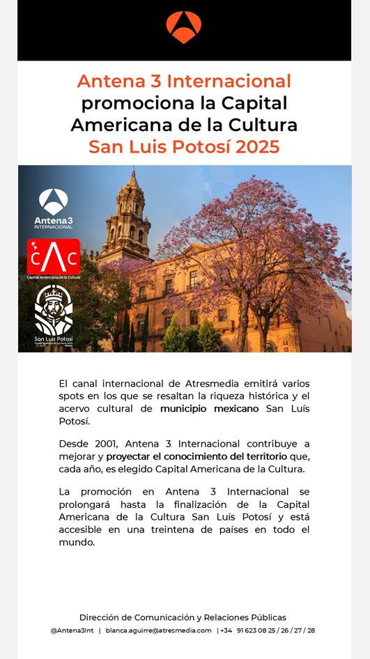 Antena 3 Internacional promociona el municipio mexicano de San Luis Potosí, en su condición de Capital Americana de la Cultura 2025.