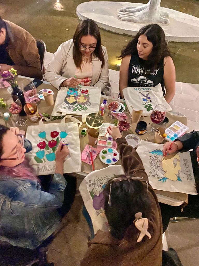 En el patio de La Barca, bajo la atmósfera surrealista de las obras de la artista inglesa, parejas, grupos de amigos y personas solitarias hallaron un punto de encuentro en el»Drink and Paint» y a la luz de las velas y copas de clericot se pintaron «tote bags» (bolsos de mano) con distintos motivos.