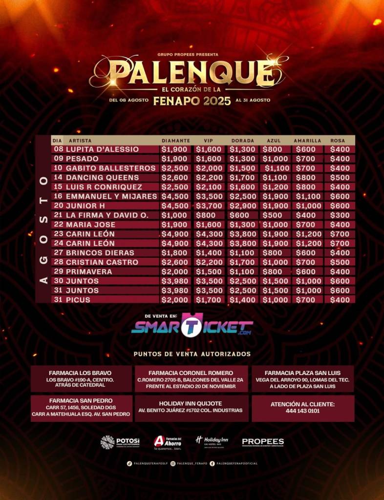 Del 8 al 31 de agosto, el Palenque será nuevamente el corazón de la fiesta potosina, presentando una cartelera de lujo que incluye artistas de talla nacional e internacional.