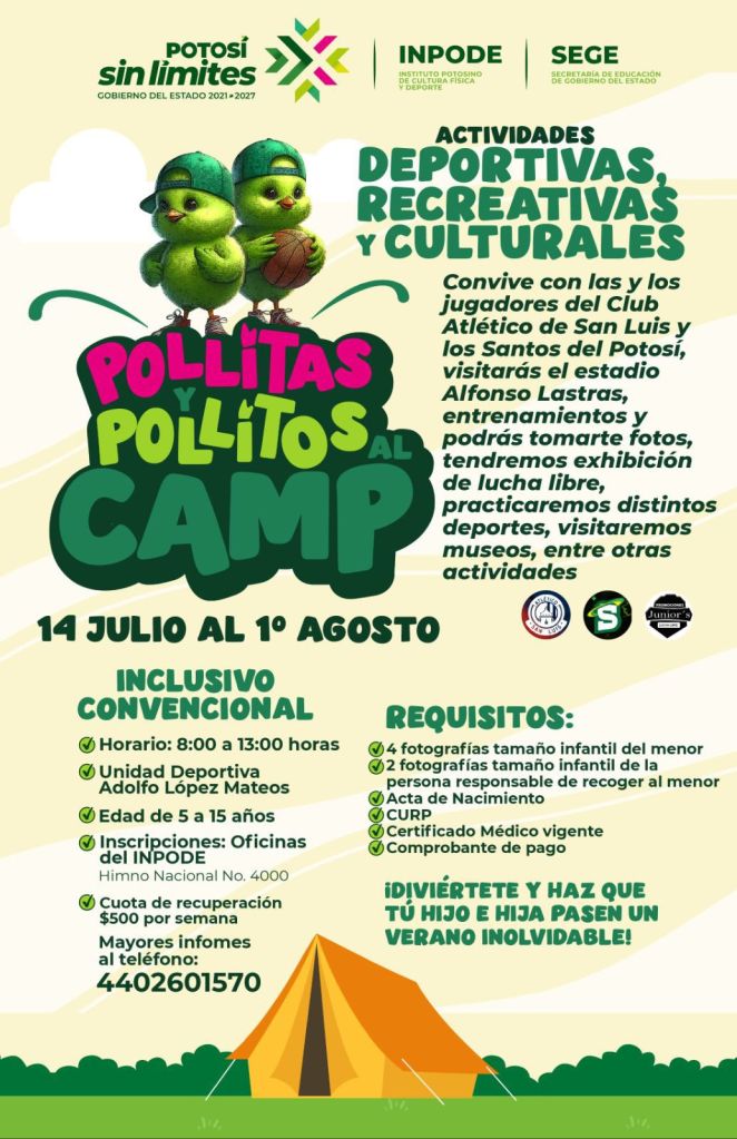 El Instituto Potosino de Cultura Física y Deporte (Inpode) invita a niñas y niños de 5 a 15 años al campamento de verano “Pollitas y Pollitos al Camp”, que se llevará a cabo del 14 de julio al 1 de agosto de 2025, con un horario de 8:00 a 13:00 horas de lunes a viernes, en la Unidad Deportiva Adolfo López Mateos y la Unidad Satélite en modalidad convencional y la Unidad José López Portillo para personas con discapacidad.