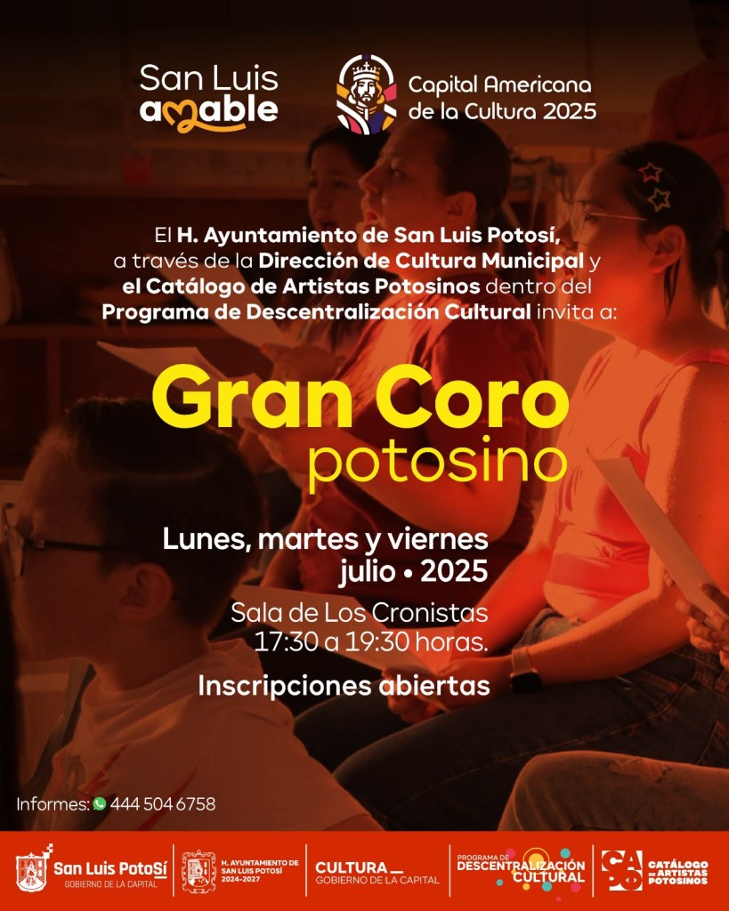 El Gobierno de la Capital en colaboración con Fomento al Canto Coral Comunitario (FOCCO), mantiene abierta la convocatoria para personas adultas y mayores de edad para formar parte del Gran Coro Potosino y el Coro Polifónico Infantil.