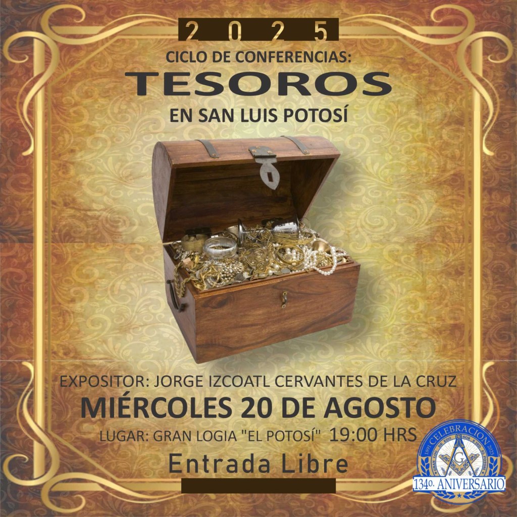 Como parte de las actividades conmemorativas por el 134° Aniversario de la Gran Logia Soberana e Independiente “El Potosí”, se ha preparado un nutrido programa cultural bajo el nombre «Tesoros en San Luis Potosí», que contempla conferencias, exposiciones y espacios de reflexión abiertos a todo público.