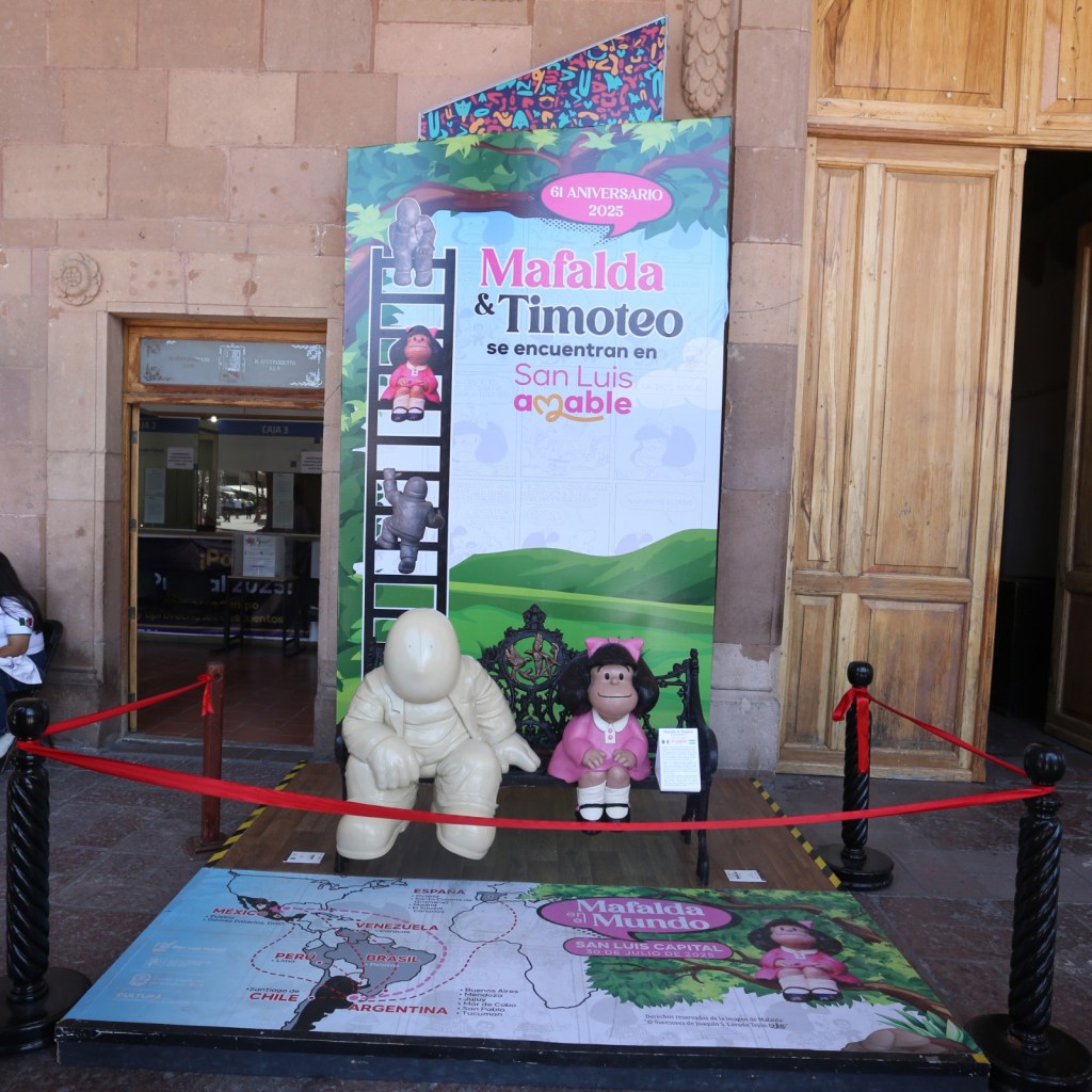“Mafalda y Timoteo se encuentran en San Luis Amable”, por lo que el Alcalde Enrique Galindo Ceballos les dio la bienvenida junto con el Escultor de Timo, Rodrigo de la Sierra, y cientos de potosinas y potosinos que ya disfrutan de estos dos personajes que llenan de colorido la Plaza de Armas y la Arquería de Palacio Municipal durante los próximos meses. El Presidente Municipal, Enrique Galindo subrayó que la presencia de estos visitantes tan distinguidos se enmarca en las acciones que se llevan a cabo por ser San Luis Potosí, Capital Americana de la Cultura 2025. Además comentó la relevancia de mantener este compromiso internacional con un amplio programa para acercar la cultura a la población y en espacios públicos. En el caso de las esculturas de Timotea se quedarán en la ciudad hasta Navidad, mientras que Mafalda seguirá permanentemente en San Luis Capital, en una banca de la Plaza de Armas.
