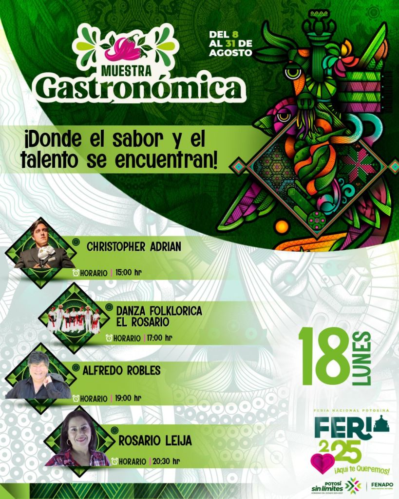 La Muestra Gastronómica cerrará la noche con Alfredo Robles a las 7:00 p.m. y Rosario Leija a las 8:00 p.m., en una jornada que une música, convivencia y tradición, reafirmando a la Fenapo como la feria más importante de México.