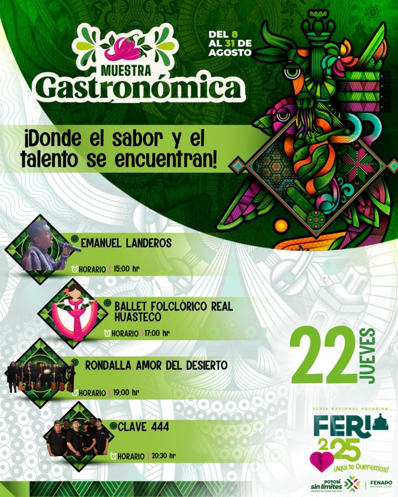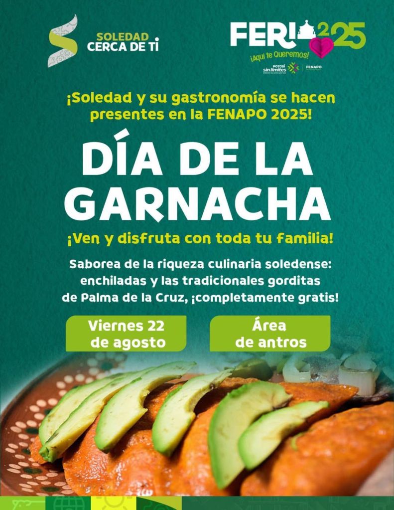 El inicio de este fin de semana en la Feria Nacional Potosina 2025 tendrá como protagonista al esperado Día de la Garnacha, una celebración que rinde homenaje a la riqueza gastronómica de Soledad de Graciano Sánchez, con su inconfundible sazón en enchiladas y gorditas de Palma de la Cruz, que deleitarán a miles de visitantes en el recinto ferial.