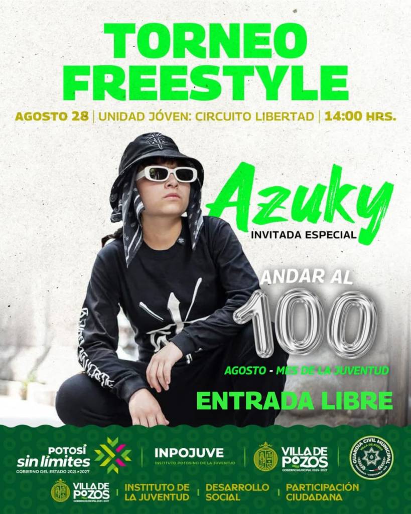 La rapera Azuki será la invitada especial en una jornada que incluirá talleres de freestyle, mercadito emprendedor, premios en efectivo y más actividades que fortalecen sin límites el desarrollo integral de las y los jóvenes tal como lo ha instruido el Gobernador Ricardo Gallardo Cardona.