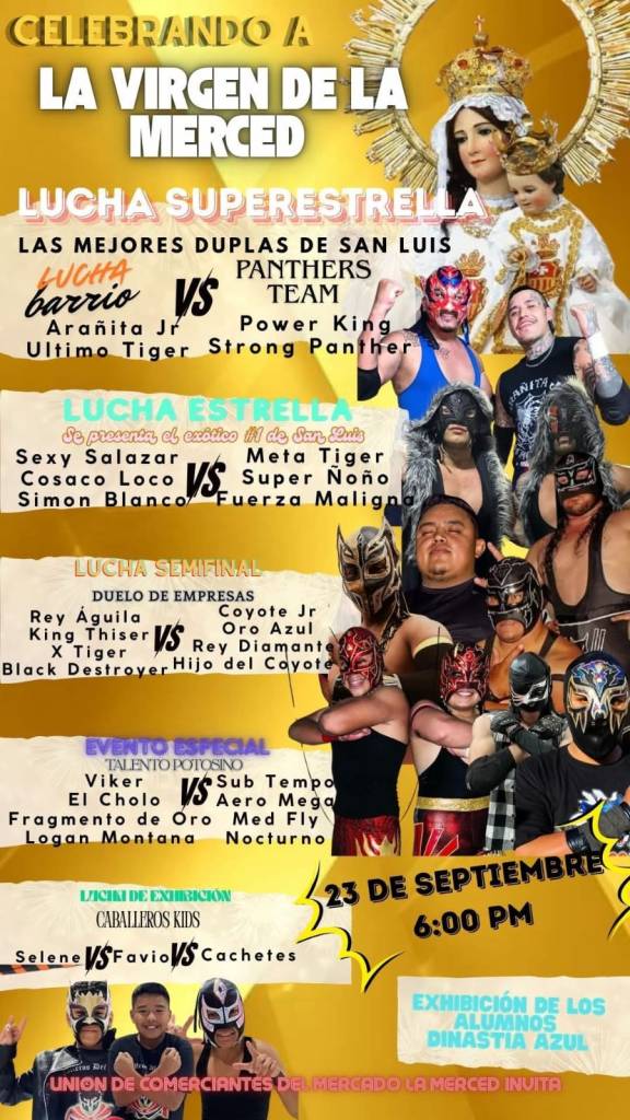 🎉🤼♂️ La Unión de Comerciantes del Mercado de la Merced invita a todos a disfrutar de una gran función de LUCHA LIBRE 🔥 celebrando a la Virgen de la Merced 🙏🌹
