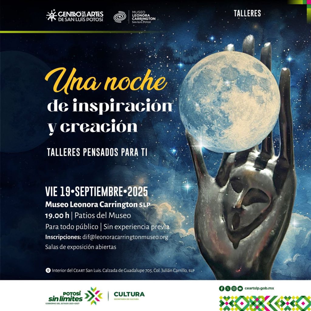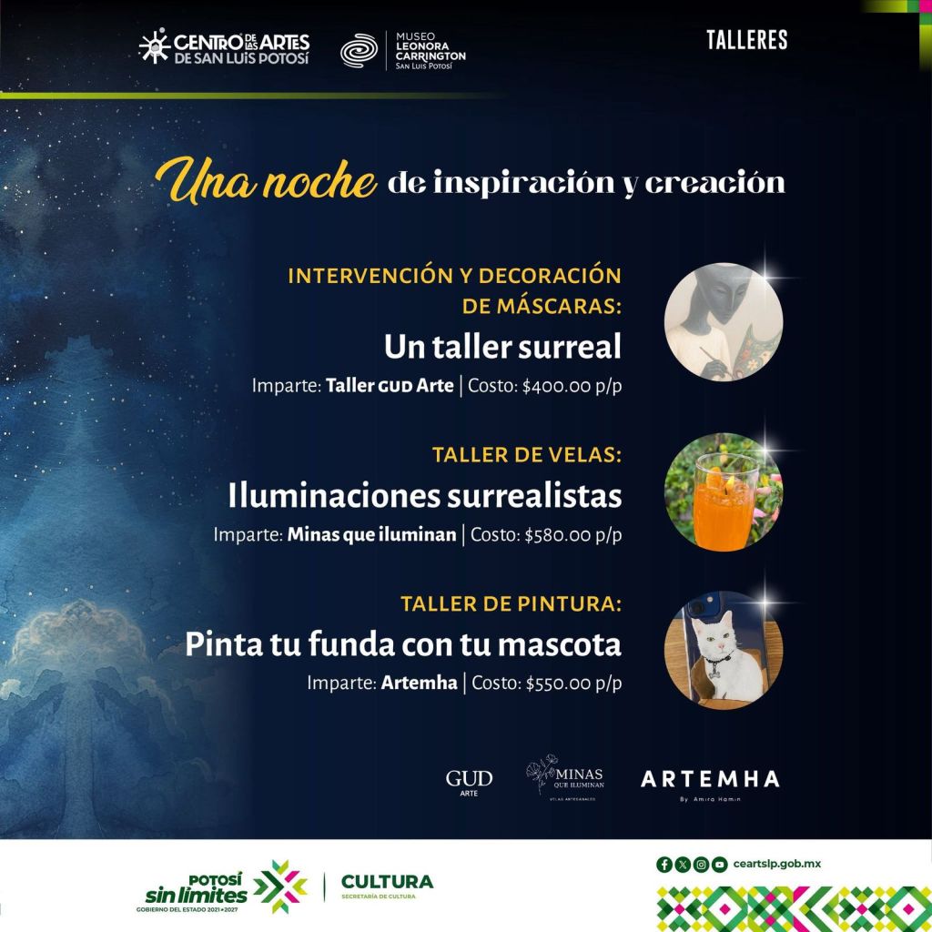 El sábado 20, la agenda incluye taller de lectura grupal de Freud Del Inconsciente al Surrealismo, en el patio del museo Leonora Carrington a las 10:09 horas y taller de acuarela en el museo Francisco Cossio a las 12:00 horas, además de la gala musical María Grever en el Francisco Cossío a las 19:00 horas y el tercer concierto de temporada de la Orquesta Sinfónica de San Luis Potosí en el Teatro de la Paz a las 20:00 horas.