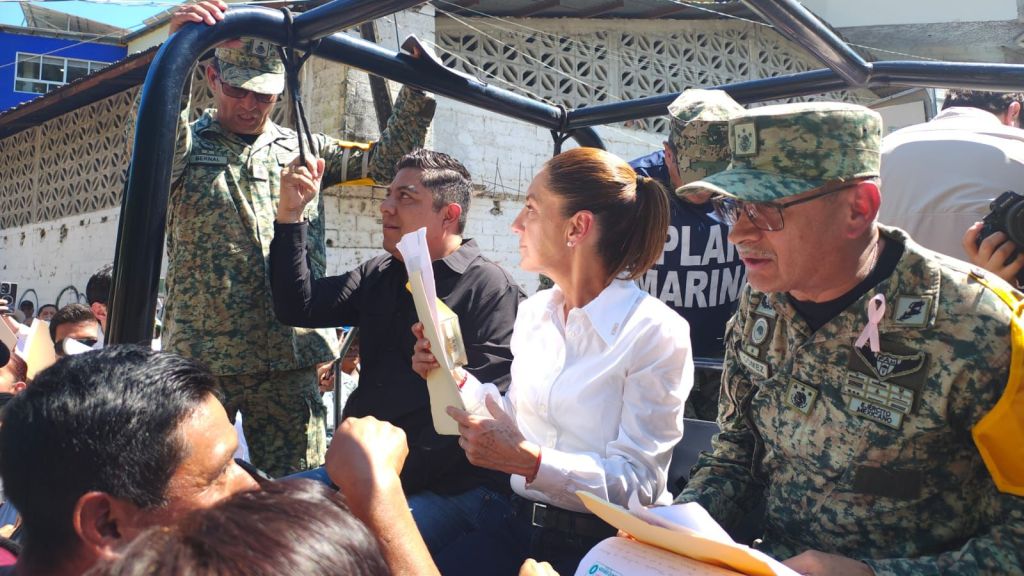 La Presidenta y el Gobernador recorren en un Jeep militar las calles donde han sido recibidos por familias que les agradecen la intervención oportuna ante las inundaciones que afectaron gran parte de la huasteca potosina.