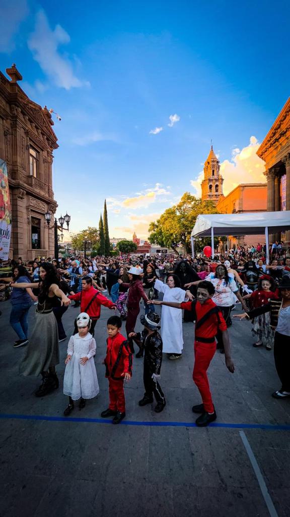 Miles de niñas, niños, jóvenes y adultos se sumaron a esta colorida coreografía que transformó el Centro Histórico en un escenario lleno de energía, creatividad y talento potosino. Disfrazados como zombis y personajes emblemáticos del clásico musical, los participantes dieron vida a un espectáculo que fortaleció la convivencia social y el orgullo cultural de San Luis Potosí.