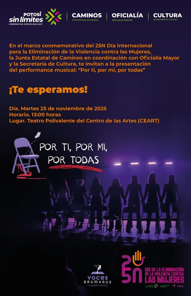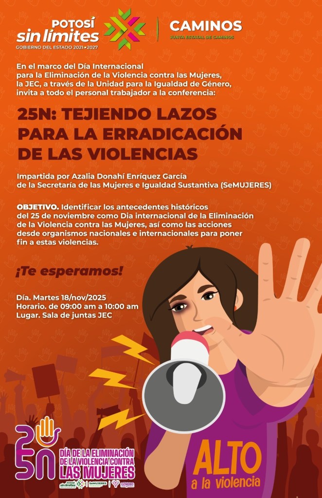En el marco del Día Internacional para la Eliminación de la Violencia contra la Mujer, la Junta Estatal de Caminos (JEC), realizará actividades conmemorativas para promover la erradicación de todo tipo de violencias contra las mujeres en el ámbito institucional y público, en coordinación con la Secretaría de Cultura (Secult) y la Oficialía Mayor del Ejecutivo.