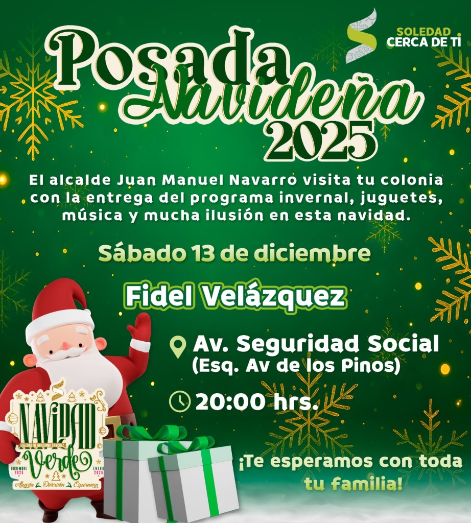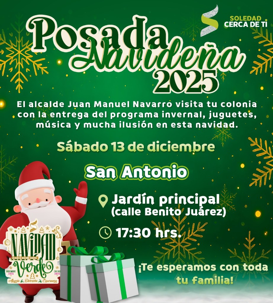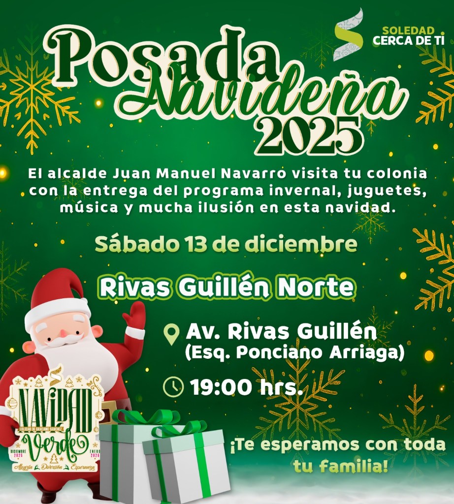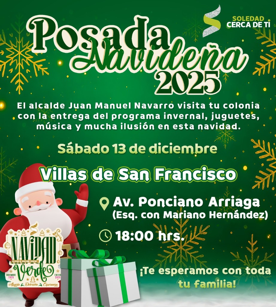 Juan Manuel Navarro Muñiz, Alcalde de Soledad de Graciano Sánchez, anunció el comienzo del recorrido de Posadas Navideñas, a partir de este sábado 13 de diciembre, en diversas colonias y comunidades, comenzando en Praderas del Maurel, San Antonio, Villas de San Francisco, Rivas Guillén Norte y Fidel Velázquez; para el domingo 14, las celebraciones continuarán en Hogares Ferrocarrileros, Rivas Guillén Sur, Hogares Obreros y San Luis Uno, con la entrega de cobertores como parte del Programa Invernal, juguetes para niñas y niños, payasos, dulces y una convivencia sin igual, creando un ambiente de alegría que la temporada transmite.