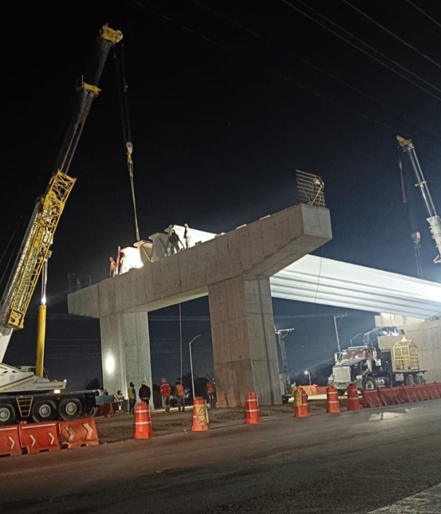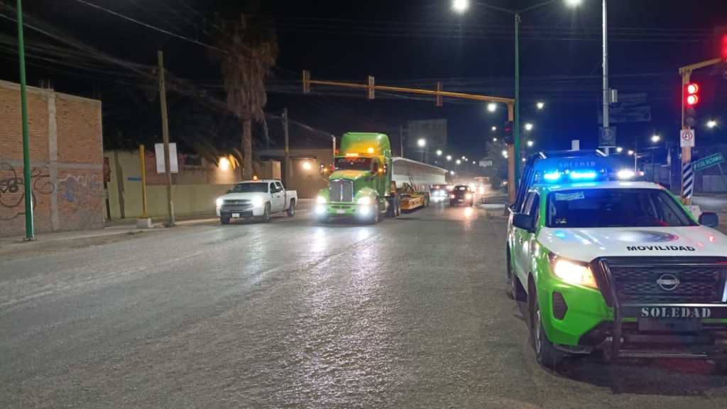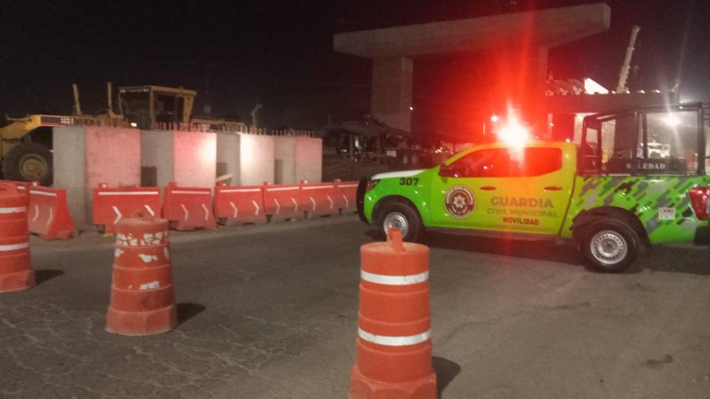 Desde este viernes, en la zona de la obra de construcción del puente vehicular del bulevar Valle de los Fantasmas y Circuito Potosí, la Dirección de Seguridad Vial y Movilidad de Soledad realiza cierres viales nocturnos, debido a la llegada de trabes de grandes dimensiones. Desde las 11 de la noche y hasta las 2 de la mañana, oficiales permanecen indicando el uso de vías alternas.