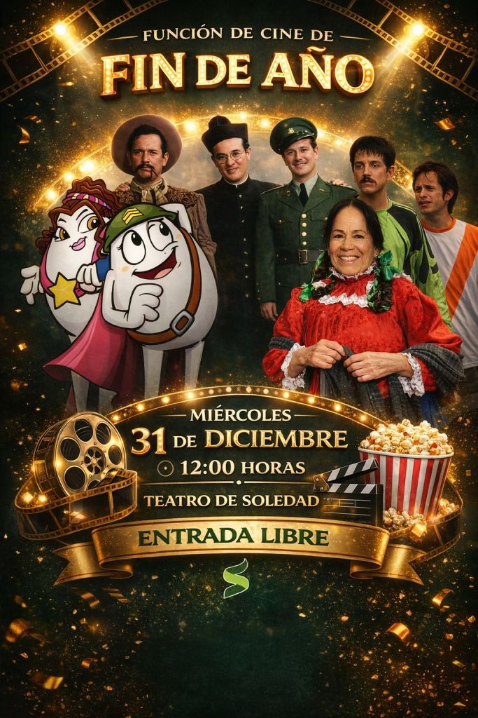 El Ayuntamiento de Soledad de Graciano Sánchez, a través de la Dirección de Cultura y Turismo, invita a las familias soledenses a despedir el año con una función especial de cine gratuito este miércoles 31 de diciembre, en el Teatro y Centro Cultural «Doroteo Arango», donde a partir de las 12:00 del día se proyectará un ciclo de películas emblemáticas para disfrutar en familia y fortalecer la convivencia, atendiendo a la encomienda del Alcalde Juan Manuel Navarro Muñiz de acercar la cultura a la población.
