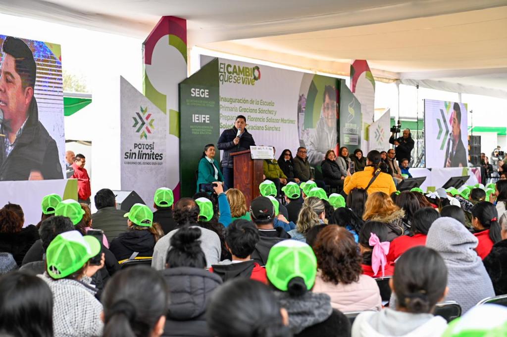 Con la entrega de la primaria “Graciano Sánchez” y la preparatoria “Florencio Salazar Martínez” en Soledad de Graciano Sánchez, el Gobernador reafirma su compromiso de atender el diálogo que se realiza con padres y madres de familia, a quien se les escucha, atiende y cumple en beneficio de sus hijas e hijos. Los nuevos planteles cuentan con seis nuevas aulas, equipadas con mesabancos y pizarrones, así como una red eléctrica segura y una cancha deportiva techada.