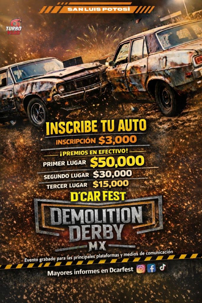 Adrenalina, motores y choques controlados serán parte del D’Car Fest Demolition Derby MX, que se llevará a cabo el próximo 8 de marzo a las 12:00 horas en las instalaciones de la Feria Nacional Potosina (Fenapo). Pilotos locales y nacionales competirán en una intensa y estratégica contienda sobre ruedas, como parte del cambio que se vive y se siente en la oferta de espectáculos innovadores impulsada por el Gobernador Ricardo Gallardo Cardona.