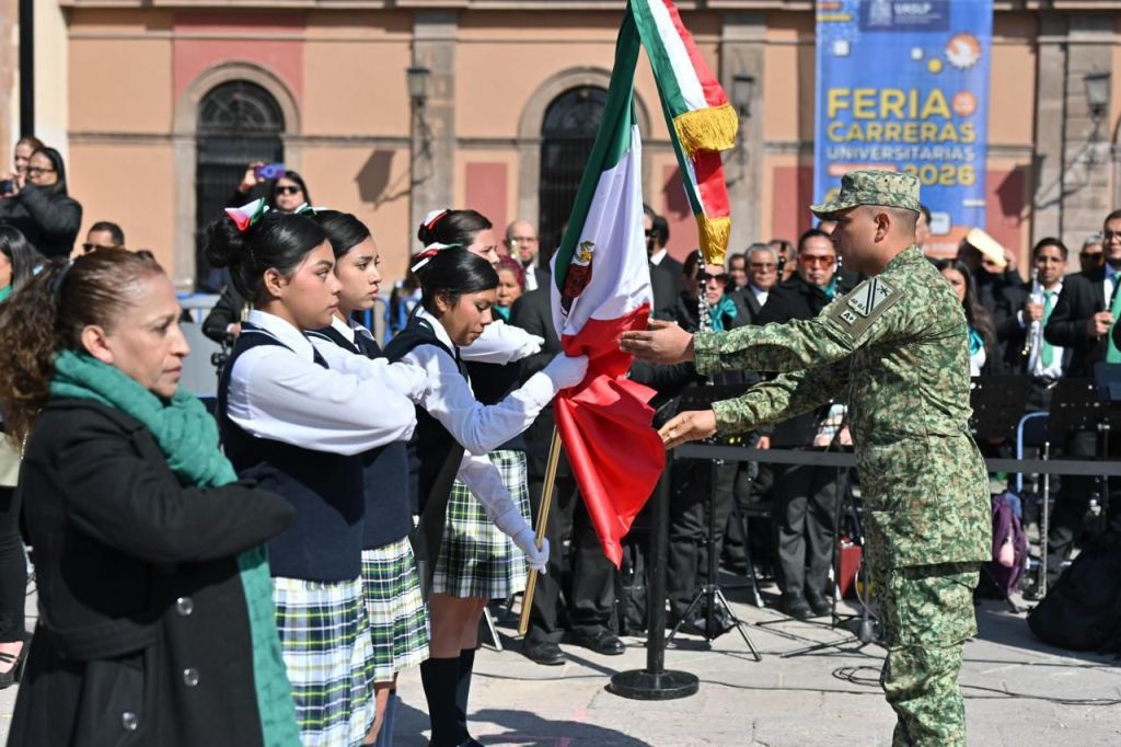 Ante la participación de diversas escuelas del nivel básico educativo, Ricardo Gallardo compartió que la bandera de México “es la representación viva de lo que somos; el verde significa la esperanza del pueblo mexicano; el blanco, la paz que tiene nuestro país, y el rojo, el sacrificio de los que nos dieron patria y libertad”, por lo que hizo el llamado a niños, niñas y jóvenes a sentirse orgullosos de ser mexicanos, de ser de San Luis Potosí y de ser el futuro de esta nación.
