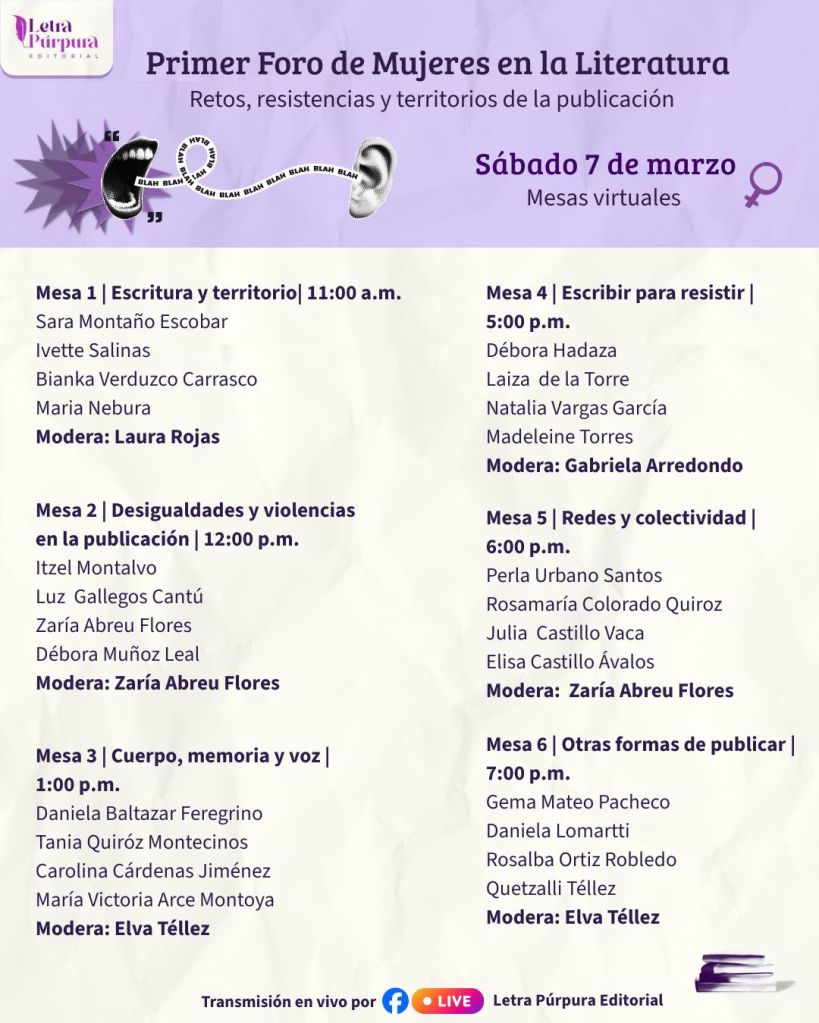 Sigue la transmisión y las actualizaciones en la página de Facebook de Letra Púrpura Editorial.