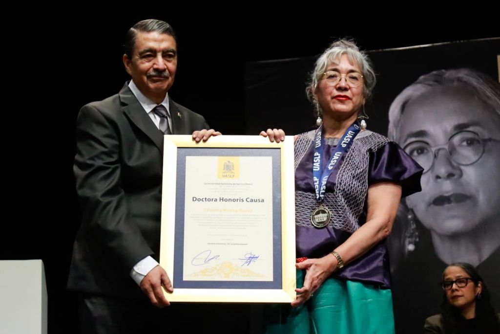 En reconocimiento a sus destacadas trayectorias y aportaciones a la literatura, la investigación y el pensamiento crítico en los ámbitos nacional e internacional, la Universidad Autónoma de San Luis Potosí otorgó el Doctorado Honoris Causa a la escritora Cristina Rivera Garza y al escritor Juan Villoro, en ceremonia solemne celebrada en el Teatro del Centro Cultural Universitario Bicentenario, tras la sesión extraordinaria del Consejo Directivo Universitario.