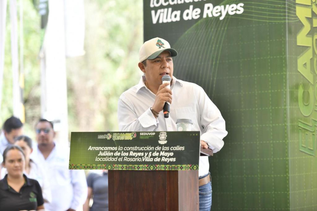 • El Gobernador del Estado llevó al municipio más infraestructura vial, moderna y confiable, que permite traslados más seguros y eficientes.Ricardo Gallardo Cardona, Gobernador de San Luis Potosí, continúa impulsando cambios positivos en el municipio de Villa de Reyes y en esta ocasión, inició la pavimentación integral de las calles Julián de los Reyes y 5 de Mayo, en la comunidad de El Rosario, para abatir el rezago social mediante la aplicación de concreto hidráulico, luminarias LED, señalamientos, banquetas y pintura, dignificando así el entorno de sus habitantes.